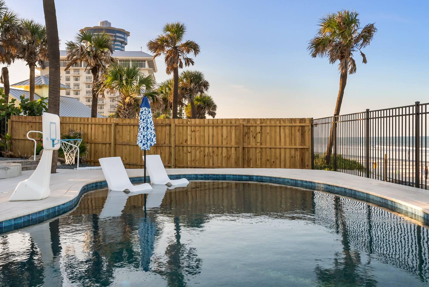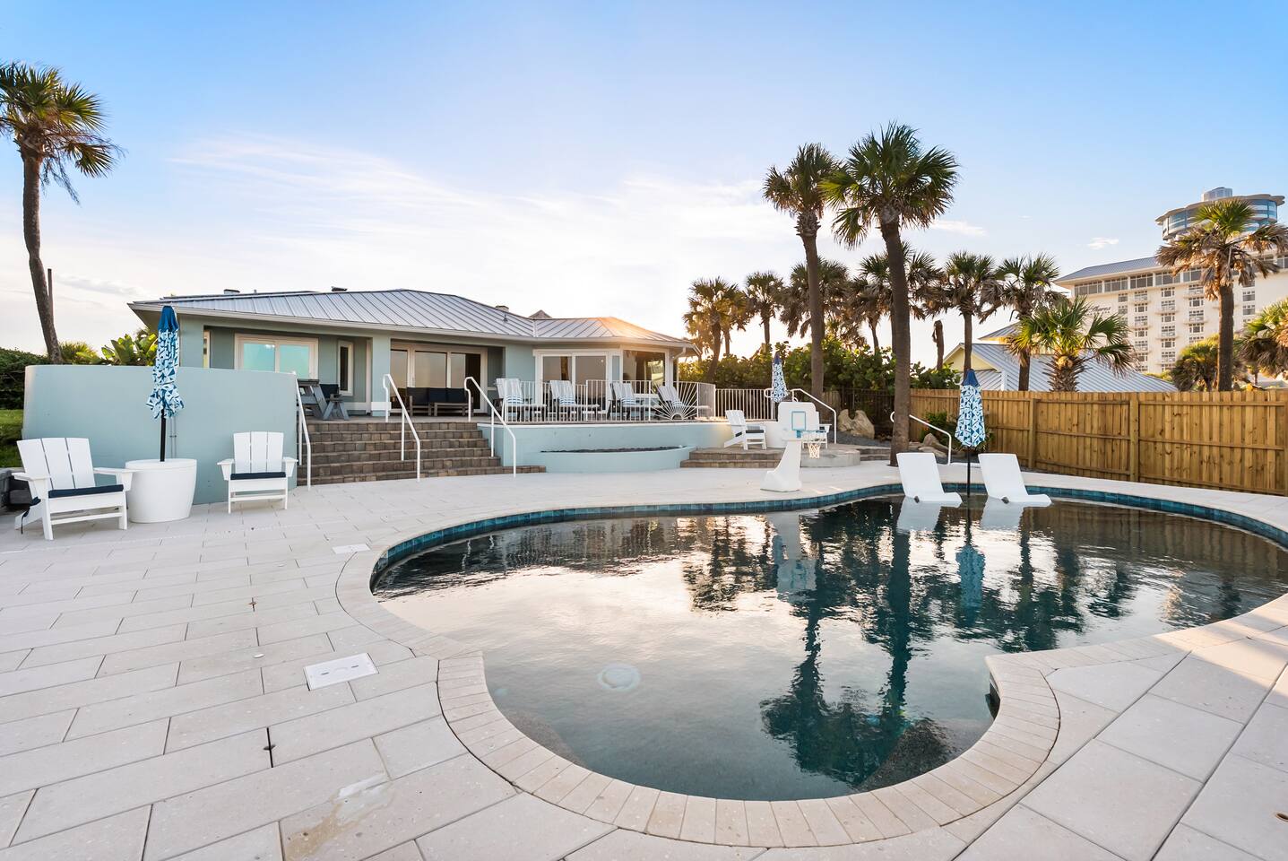 Your Oceanfront Villa! Wake up in your very own designer master suite, to panoramic ocean views in this luxury 3BR/2BA villa in Daytona Beach Shores. Spend your afternoon in your private oceanfront pool. Featuring a Chef's Kitchen with quartz counters, stainless appliances, and island seating. Enjoy nearly an acre of private oceanfront with lush landscaping and plenty of room to relax. Perfect for family vacations, romantic escapes, or group getaways! Your dream oceanfront vacation awaits!