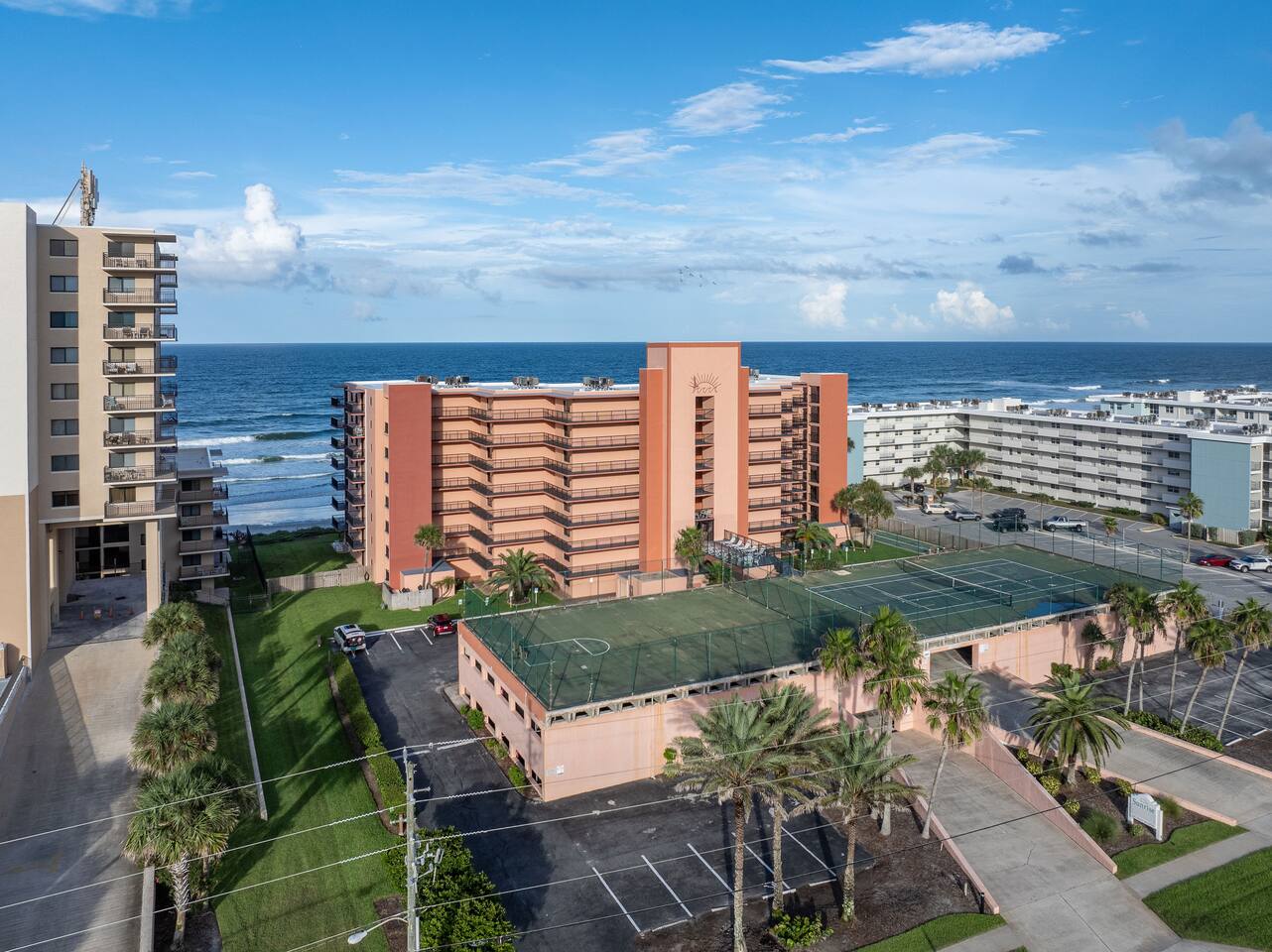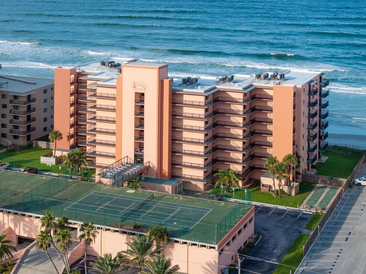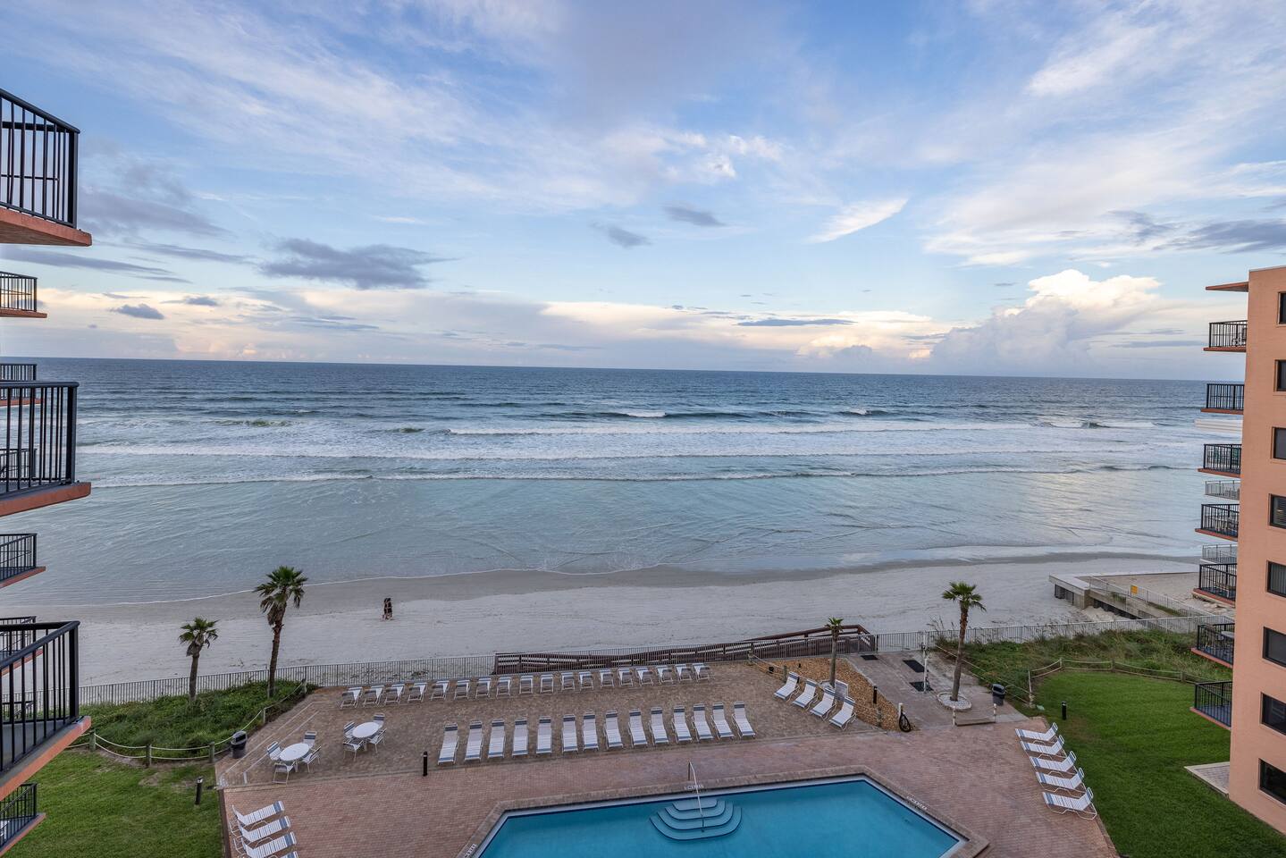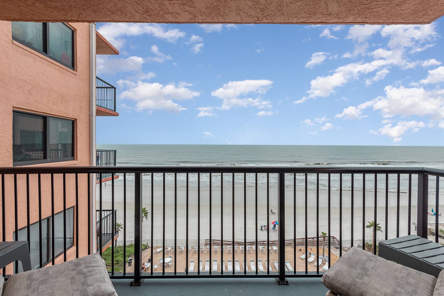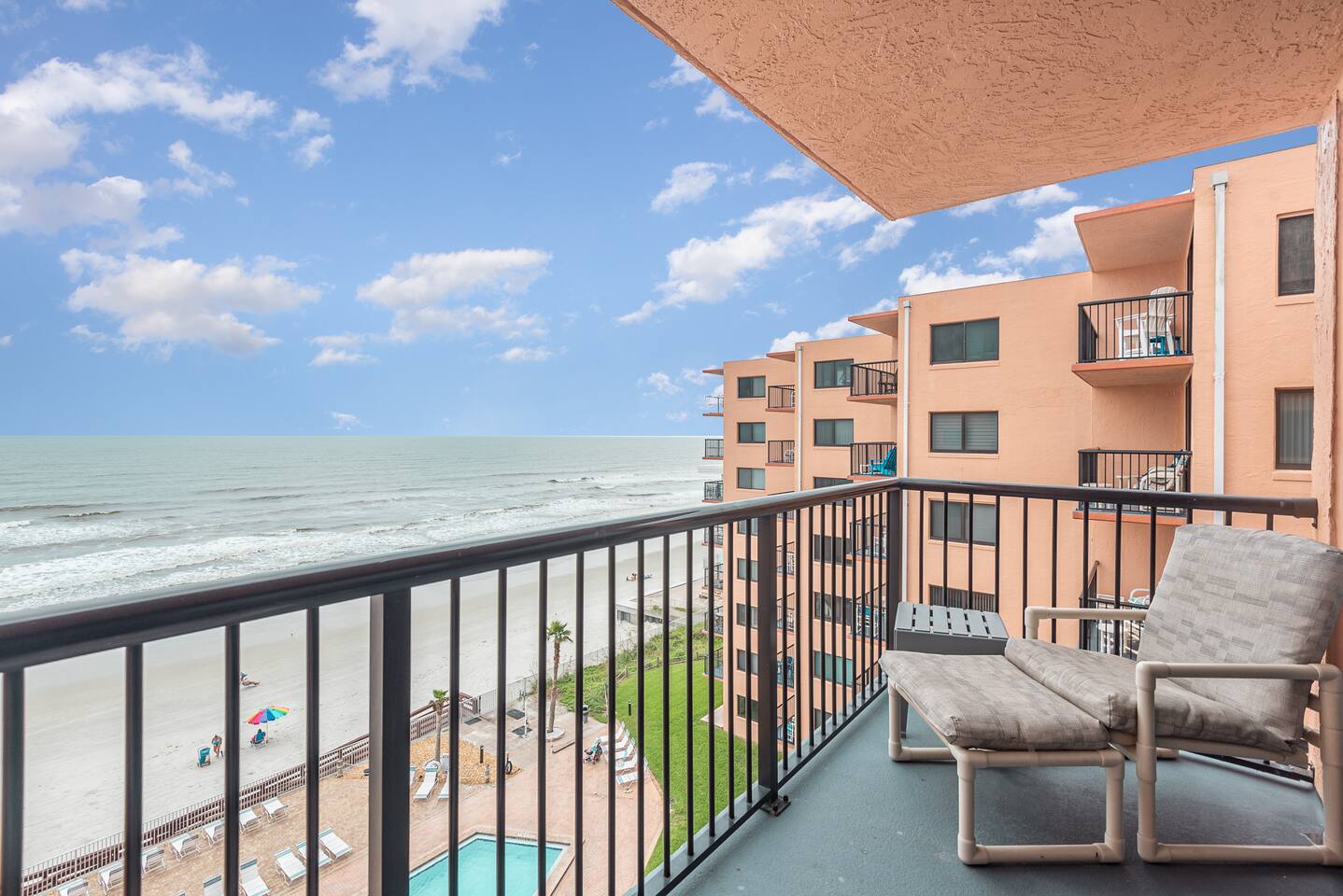 The Space Welcome to your oceanfront escape in New Smyrna Beach — where every day begins with sunrise views over the Atlantic and ends with the sound of gentle waves. Thoughtfully updated, this 2-bedroom, 2-bath condo offers modern comfort in a relaxed coastal setting ideal for families, couples, or small groups. 🌊 Main Living Area ⭐ Open-concept layout with panoramic ocean views ⭐ Plush sofa and Smart TV for cozy movie nights ⭐ Sliding glass doors open to the private beachfront balcony ⭐ Dining area perfect for shared meals or board games 🍳 Kitchen ⭐ Fully equipped with cookware, utensils, and full-size appliances ⭐ Coffee maker, blender, and dishwasher for easy cleanup ⭐ Breakfast bar with ocean views for casual dining 🛏 Primary Bedroom ⭐ King bed with premium linens and ocean views ⭐ Direct balcony access for morning coffee or sunset views 🛏 Primary Bedroom ⭐ King bed with premium linens and ocean views ⭐ Direct balcony access for morning coffee or sunset views ⭐ Ensuite bathroom with walk-in shower and upgraded fixtures ⭐ Smart TV and ample closet storage 🛏 Guest Bedroom ⭐ Full bed plus twin bed — ideal for families or friends ⭐ Smart TV and generous storage space ⭐ Easy access to a full bathroom with grab bars for added safety 🛁 Bathrooms ⭐ Two full bathrooms with fresh towels and toiletries ⭐ Walk-in shower in the master bath ⭐ Hair dryer and starter bath essentials provided 💻 Work & Connectivity ⭐ High-speed WiFi (350+ Mbps) for remote work or streaming ⭐ Dedicated workspace with inspiring ocean backdrop ☀️ Outdoor Space ⭐ Private oceanfront balcony with comfortable seating ⭐ Shared swimming pool and sun loungers ⭐ Direct beach access from the property ⭐ Outdoor grill and picnic area ⭐ Pickleball and tennis courts on-site 🧺 Convenience ⭐ Smart lock entry for seamless check-in ⭐ Free on-site parking ⭐ Washer/dryer in unit ⭐ Beach gear, toys, and chairs provided 📍 Location ⭐ Prime oceanfront spot on New Smyrna Beach ⭐ Minutes to Flagler Avenue’s restaurants, shops, and cafe. ⭐ Close to surf spots, parks, and the Intracoastal Waterway