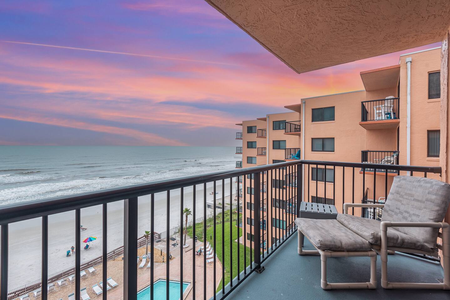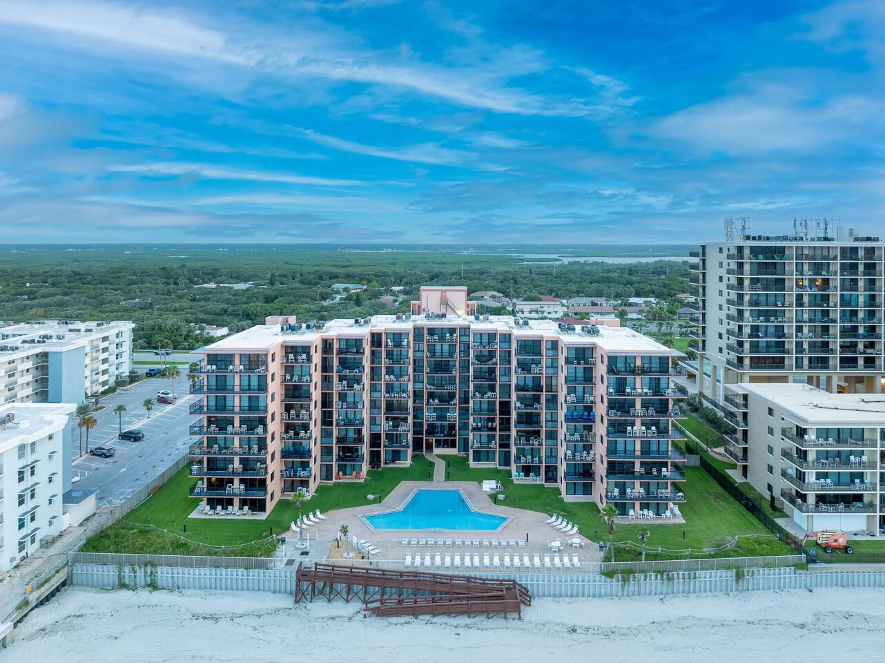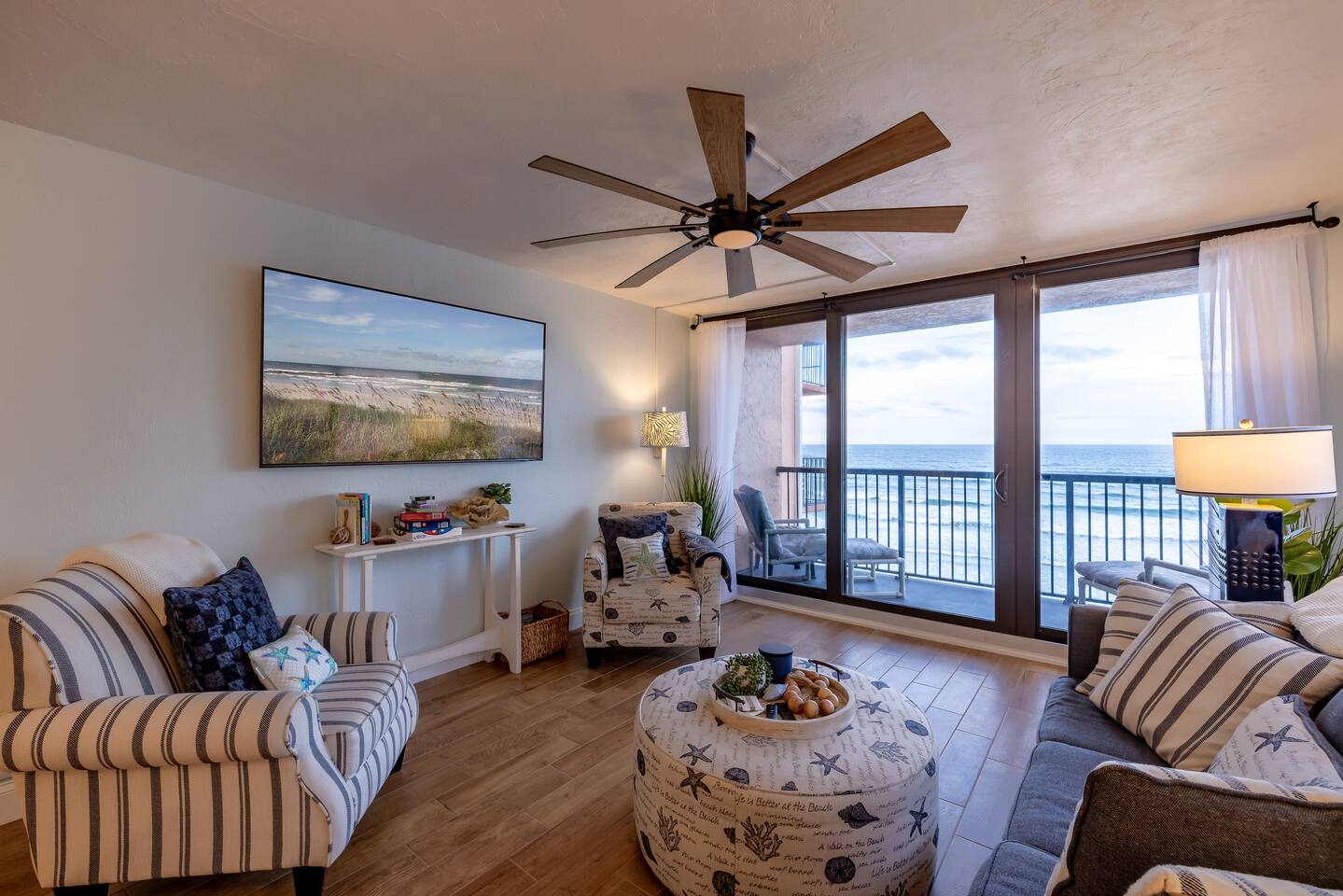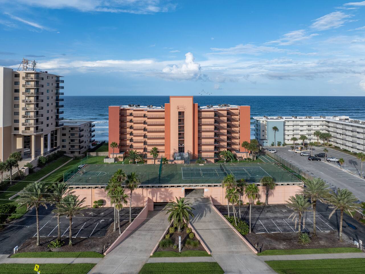 The Space Welcome to your oceanfront escape in New Smyrna Beach — where every day begins with sunrise views over the Atlantic and ends with the sound of gentle waves. Thoughtfully updated, this 2-bedroom, 2-bath condo offers modern comfort in a relaxed coastal setting ideal for families, couples, or small groups. 🌊 Main Living Area ⭐ Open-concept layout with panoramic ocean views ⭐ Plush sofa and Smart TV for cozy movie nights ⭐ Sliding glass doors open to the private beachfront balcony ⭐ Dining area perfect for shared meals or board games 🍳 Kitchen ⭐ Fully equipped with cookware, utensils, and full-size appliances ⭐ Coffee maker, blender, and dishwasher for easy cleanup ⭐ Breakfast bar with ocean views for casual dining 🛏 Primary Bedroom ⭐ King bed with premium linens and ocean views ⭐ Direct balcony access for morning coffee or sunset views 🛏 Primary Bedroom ⭐ King bed with premium linens and ocean views ⭐ Direct balcony access for morning coffee or sunset views ⭐ Ensuite bathroom with walk-in shower and upgraded fixtures ⭐ Smart TV and ample closet storage 🛏 Guest Bedroom ⭐ Full bed plus twin bed — ideal for families or friends ⭐ Smart TV and generous storage space ⭐ Easy access to a full bathroom with grab bars for added safety 🛁 Bathrooms ⭐ Two full bathrooms with fresh towels and toiletries ⭐ Walk-in shower in the master bath ⭐ Hair dryer and starter bath essentials provided 💻 Work & Connectivity ⭐ High-speed WiFi (350+ Mbps) for remote work or streaming ⭐ Dedicated workspace with inspiring ocean backdrop ☀️ Outdoor Space ⭐ Private oceanfront balcony with comfortable seating ⭐ Shared swimming pool and sun loungers ⭐ Direct beach access from the property ⭐ Outdoor grill and picnic area ⭐ Pickleball and tennis courts on-site 🧺 Convenience ⭐ Smart lock entry for seamless check-in ⭐ Free on-site parking ⭐ Washer/dryer in unit ⭐ Beach gear, toys, and chairs provided 📍 Location ⭐ Prime oceanfront spot on New Smyrna Beach ⭐ Minutes to Flagler Avenue’s restaurants, shops, and cafe. ⭐ Close to surf spots, parks, and the Intracoastal Waterway