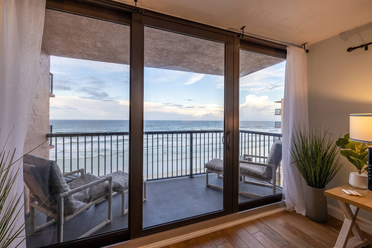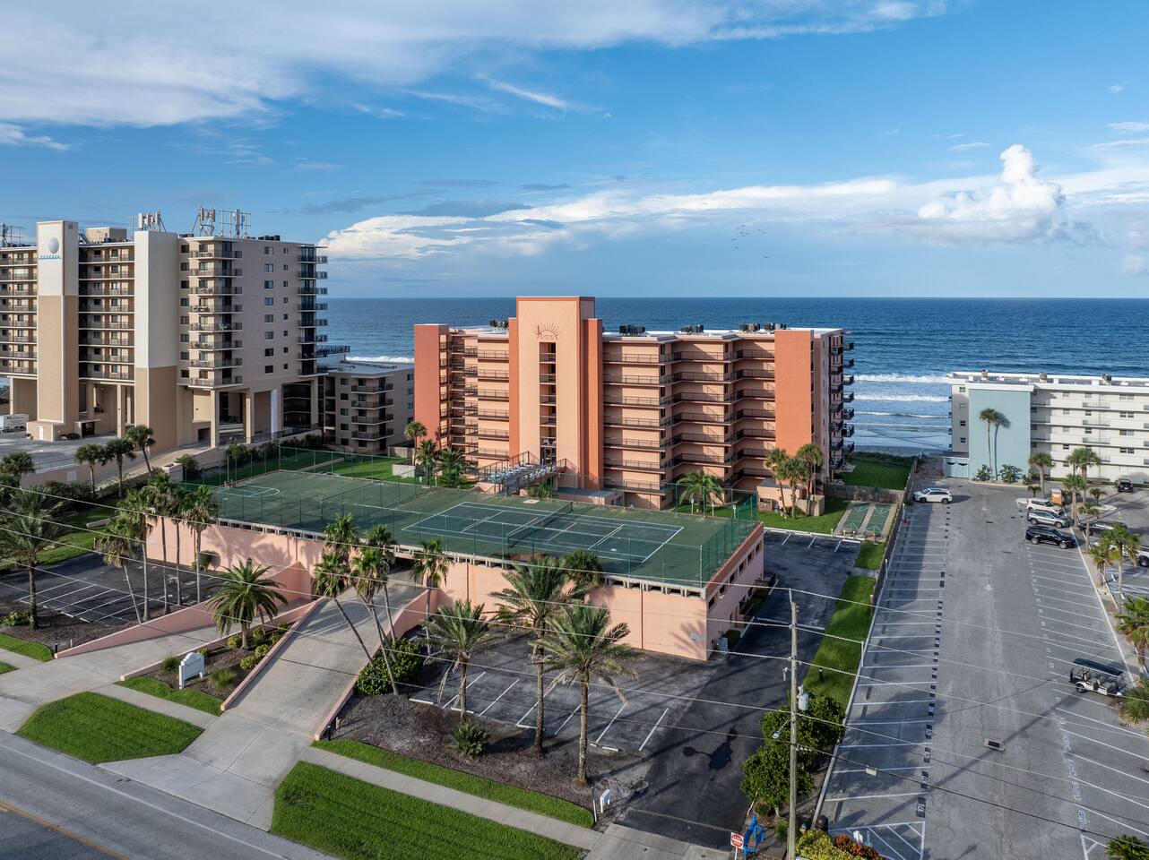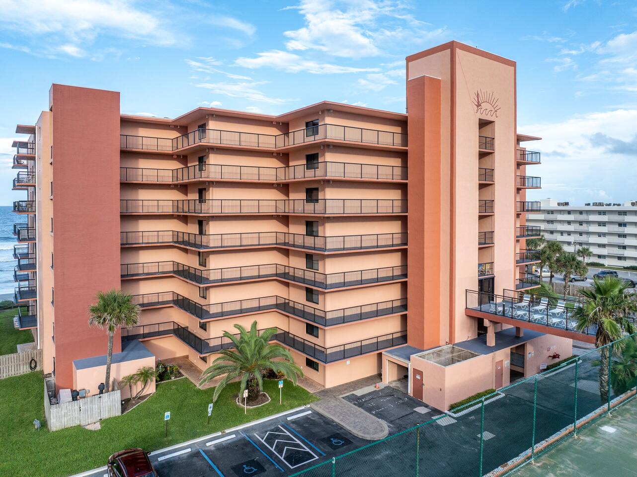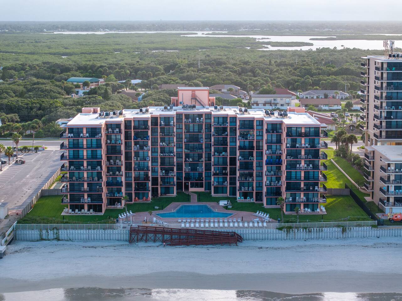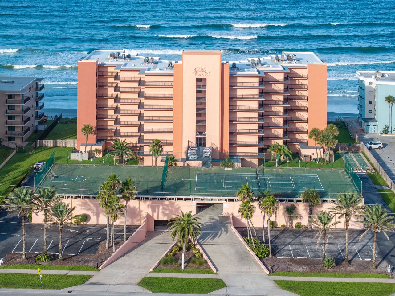The Space Welcome to your oceanfront escape in New Smyrna Beach — where every day begins with sunrise views over the Atlantic and ends with the sound of gentle waves. Thoughtfully updated, this 2-bedroom, 2-bath condo offers modern comfort in a relaxed coastal setting ideal for families, couples, or small groups. 🌊 Main Living Area ⭐ Open-concept layout with panoramic ocean views ⭐ Plush sofa and Smart TV for cozy movie nights ⭐ Sliding glass doors open to the private beachfront balcony ⭐ Dining area perfect for shared meals or board games 🍳 Kitchen ⭐ Fully equipped with cookware, utensils, and full-size appliances ⭐ Coffee maker, blender, and dishwasher for easy cleanup ⭐ Breakfast bar with ocean views for casual dining 🛏 Primary Bedroom ⭐ King bed with premium linens and ocean views ⭐ Direct balcony access for morning coffee or sunset views 🛏 Primary Bedroom ⭐ King bed with premium linens and ocean views ⭐ Direct balcony access for morning coffee or sunset views ⭐ Ensuite bathroom with walk-in shower and upgraded fixtures ⭐ Smart TV and ample closet storage 🛏 Guest Bedroom ⭐ Full bed plus twin bed — ideal for families or friends ⭐ Smart TV and generous storage space ⭐ Easy access to a full bathroom with grab bars for added safety 🛁 Bathrooms ⭐ Two full bathrooms with fresh towels and toiletries ⭐ Walk-in shower in the master bath ⭐ Hair dryer and starter bath essentials provided 💻 Work & Connectivity ⭐ High-speed WiFi (350+ Mbps) for remote work or streaming ⭐ Dedicated workspace with inspiring ocean backdrop ☀️ Outdoor Space ⭐ Private oceanfront balcony with comfortable seating ⭐ Shared swimming pool and sun loungers ⭐ Direct beach access from the property ⭐ Outdoor grill and picnic area ⭐ Pickleball and tennis courts on-site 🧺 Convenience ⭐ Smart lock entry for seamless check-in ⭐ Free on-site parking ⭐ Washer/dryer in unit ⭐ Beach gear, toys, and chairs provided 📍 Location ⭐ Prime oceanfront spot on New Smyrna Beach ⭐ Minutes to Flagler Avenue’s restaurants, shops, and cafe. ⭐ Close to surf spots, parks, and the Intracoastal Waterway