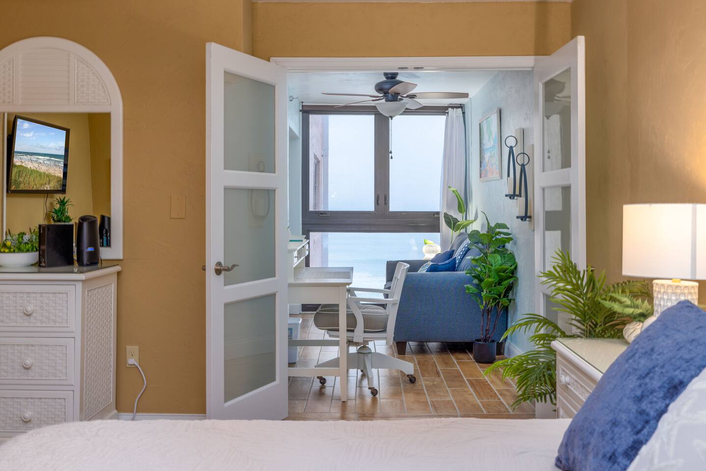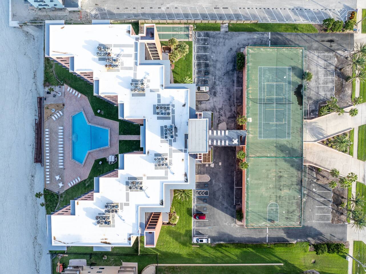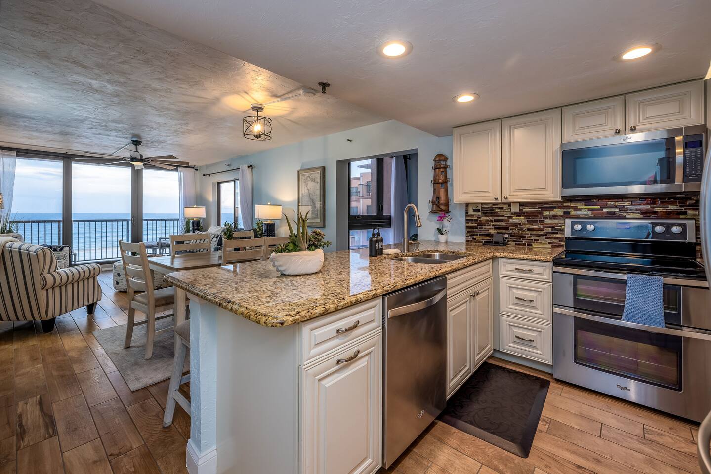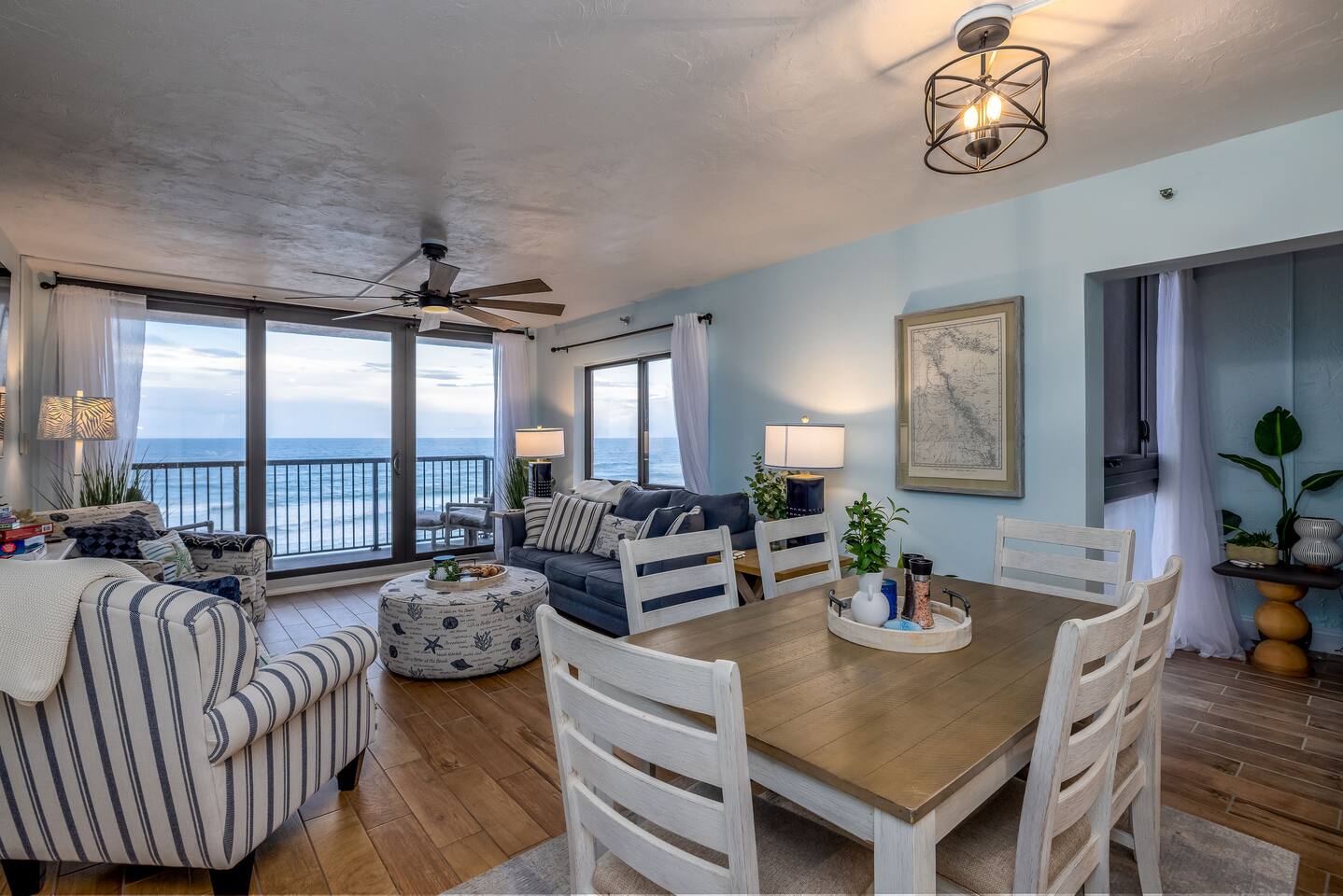 The Space Welcome to your oceanfront escape in New Smyrna Beach — where every day begins with sunrise views over the Atlantic and ends with the sound of gentle waves. Thoughtfully updated, this 2-bedroom, 2-bath condo offers modern comfort in a relaxed coastal setting ideal for families, couples, or small groups. 🌊 Main Living Area ⭐ Open-concept layout with panoramic ocean views ⭐ Plush sofa and Smart TV for cozy movie nights ⭐ Sliding glass doors open to the private beachfront balcony ⭐ Dining area perfect for shared meals or board games 🍳 Kitchen ⭐ Fully equipped with cookware, utensils, and full-size appliances ⭐ Coffee maker, blender, and dishwasher for easy cleanup ⭐ Breakfast bar with ocean views for casual dining 🛏 Primary Bedroom ⭐ King bed with premium linens and ocean views ⭐ Direct balcony access for morning coffee or sunset views 🛏 Primary Bedroom ⭐ King bed with premium linens and ocean views ⭐ Direct balcony access for morning coffee or sunset views ⭐ Ensuite bathroom with walk-in shower and upgraded fixtures ⭐ Smart TV and ample closet storage 🛏 Guest Bedroom ⭐ Full bed plus twin bed — ideal for families or friends ⭐ Smart TV and generous storage space ⭐ Easy access to a full bathroom with grab bars for added safety 🛁 Bathrooms ⭐ Two full bathrooms with fresh towels and toiletries ⭐ Walk-in shower in the master bath ⭐ Hair dryer and starter bath essentials provided 💻 Work & Connectivity ⭐ High-speed WiFi (350+ Mbps) for remote work or streaming ⭐ Dedicated workspace with inspiring ocean backdrop ☀️ Outdoor Space ⭐ Private oceanfront balcony with comfortable seating ⭐ Shared swimming pool and sun loungers ⭐ Direct beach access from the property ⭐ Outdoor grill and picnic area ⭐ Pickleball and tennis courts on-site 🧺 Convenience ⭐ Smart lock entry for seamless check-in ⭐ Free on-site parking ⭐ Washer/dryer in unit ⭐ Beach gear, toys, and chairs provided 📍 Location ⭐ Prime oceanfront spot on New Smyrna Beach ⭐ Minutes to Flagler Avenue’s restaurants, shops, and cafe. ⭐ Close to surf spots, parks, and the Intracoastal Waterway