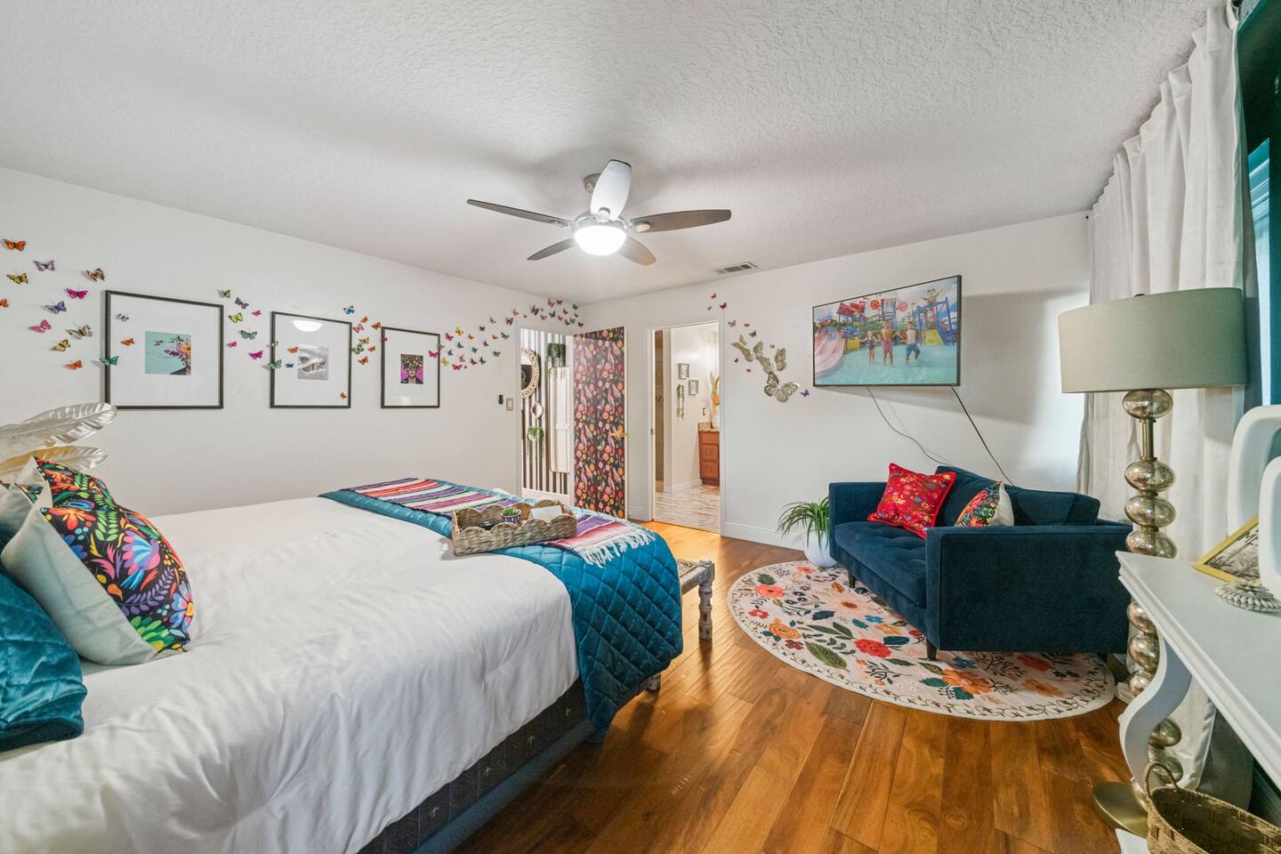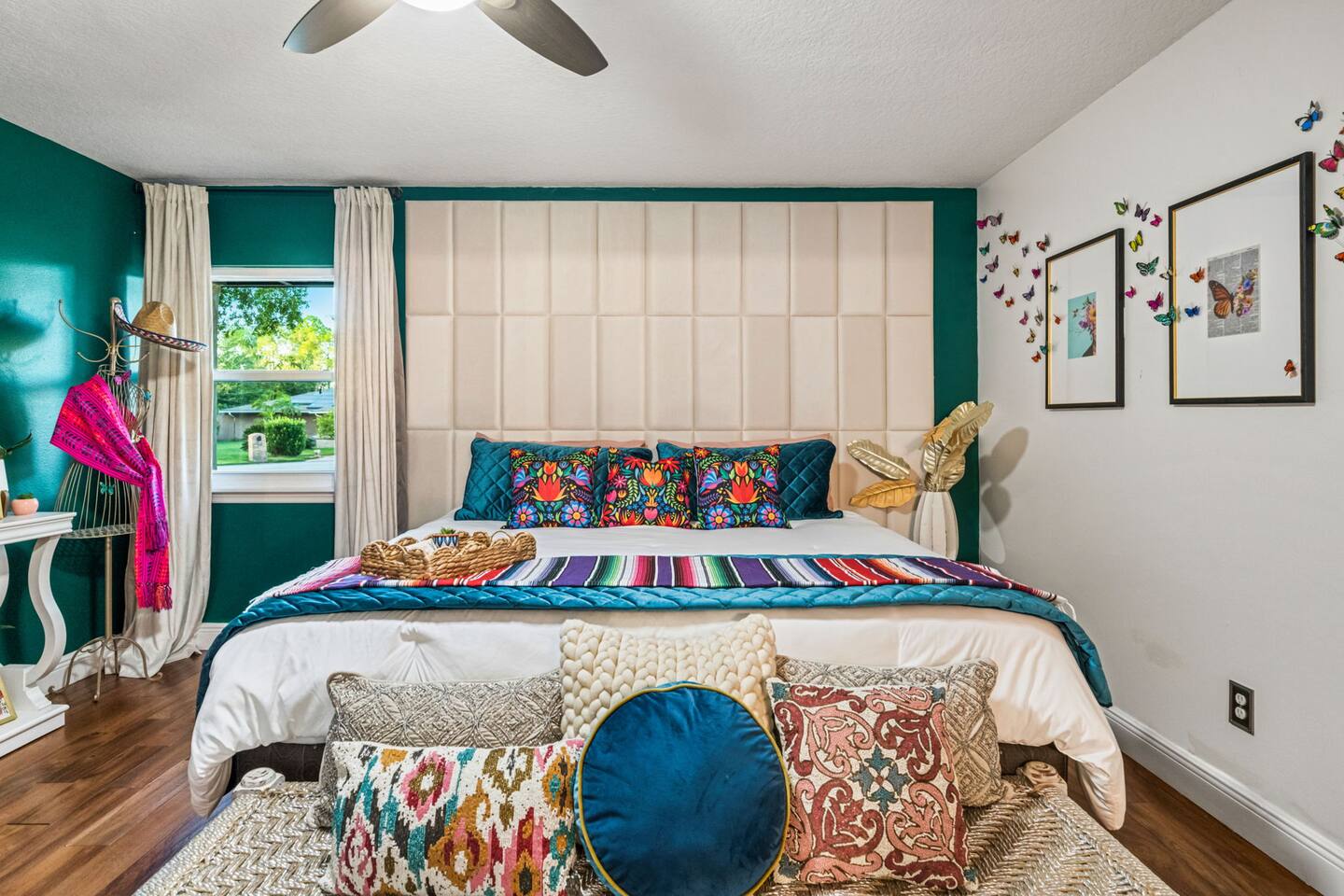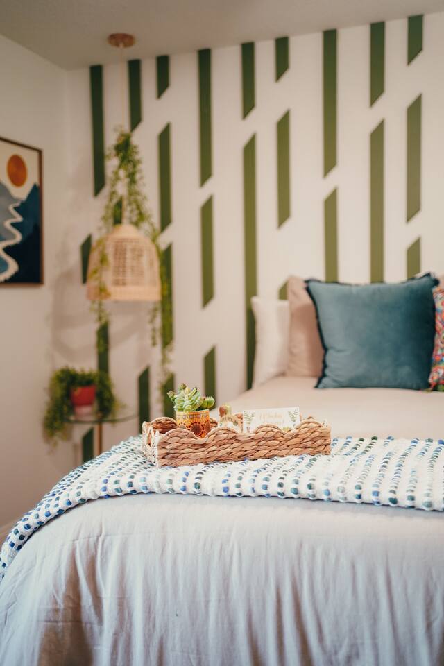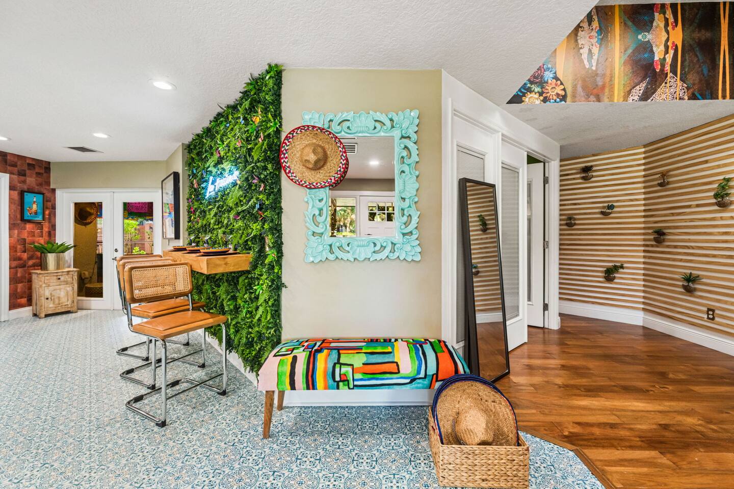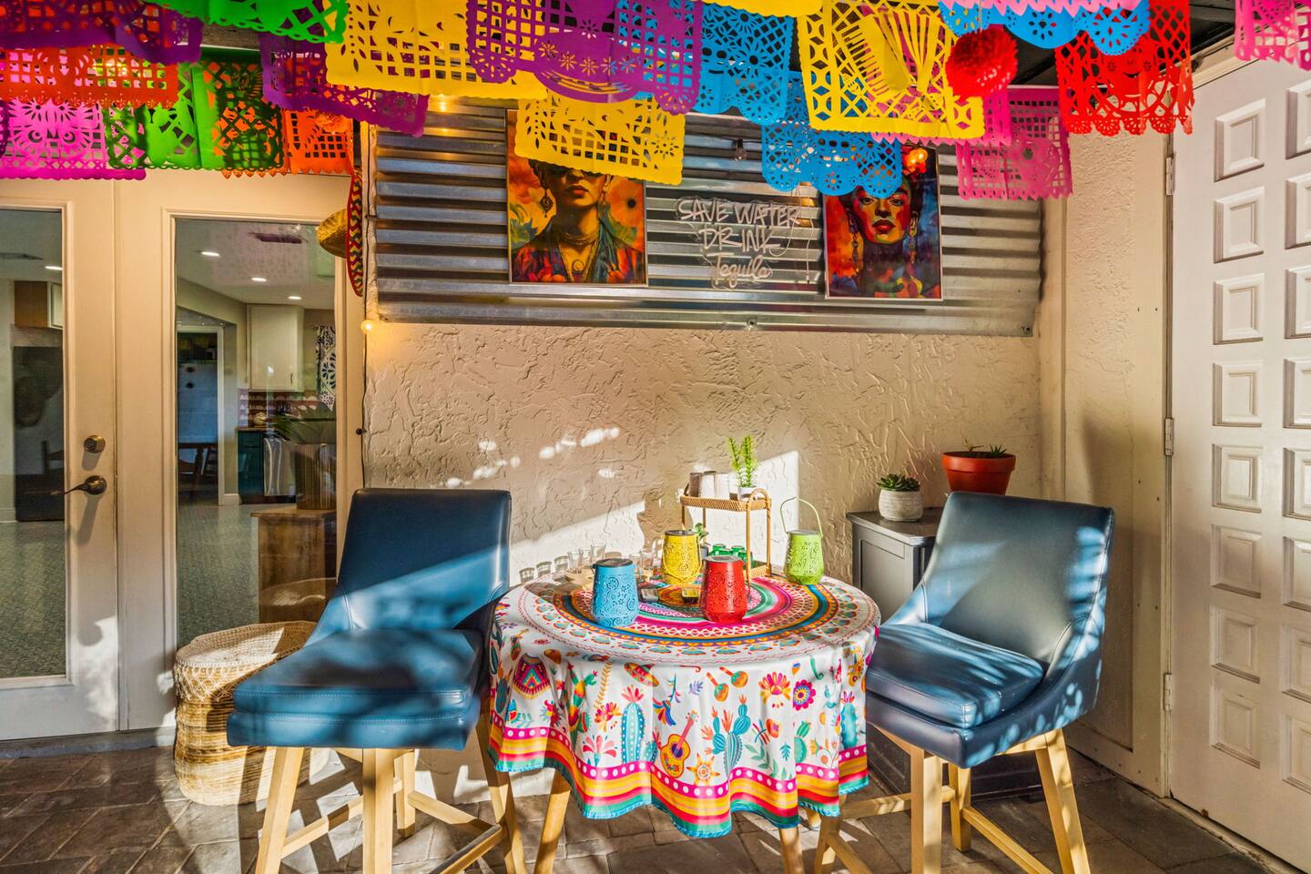 Welcome to La Hacienda, a professionally designed retreat in Central Florida that transports you straight to the heart of Mexico. From vibrant papel picado fluttering above to hand-picked artwork honoring Frida Kahlo and traditional artisans, every corner tells a story of culture and celebration. This six-bedroom, three-bath oasis isn’t just a place to sleep—it’s a colorful canvas where families and groups can gather, connect, and create memories surrounded by warmth and artistry. 🛋 Main Living Area Bright, art-filled lounge perfect for movie nights or conversation Large dining table for group meals and celebrations Open layout designed for comfort and connection 🍳 Kitchen & Dining Fully equipped chef’s kitchen with modern appliances Handcrafted accents and vibrant tilework for an authentic touch Outdoor dining under festive papel picado for unforgettable meals 🌿 Outdoor Space Private patio and garden lounge with colorful décor Gathering spots designed for relaxation and celebration Lush greenery for a true hacienda vibe 🛏 Bedrooms & Bathrooms Bedroom 1 – King Suite Spacious master at the far left of the home King bed with plush linens Bedroom 2 – Full Bedroom Located off Bedroom 1 Full bed, cozy setup for two Bedroom 3 – King Suite Master bedroom at the end of the hallway King bed with stylish décor Bedroom 4 – Queen Bedroom Second door to the right in the hallway Queen bed, vibrant and comfortable Bedroom 5 – Full Bedroom First door to the right in the hallway Full bed with fresh linens Bedroom 6 – Twin Bedroom First door to the left in the hallway Two twin beds, perfect for kids or friends 🛁 Bathrooms (3) Three well-appointed bathrooms with modern finishes. Fresh towels, toiletries, and essentials included 🎨 Design & Atmosphere Professionally designed interiors inspired by Mexican culture Homage to Frida Kahlo and traditional artistry Every detail crafted to make your stay inspiring and memorable 📍 Location Nestled in a quiet neighborhood of Central Florida Easy access to Orlando attractions, Disney World, stunning beaches, Universal Studios. Close to local dining and cultural experiences 💡 Why Book La Hacienda is more than a stay, it’s an experience. Perfect for group getaways, family gatherings, or unique celebrations, it blends vibrant design with modern comfort to create a one-of-a-kind retreat. Book now and make unforgettable memories in a home that tells a story.