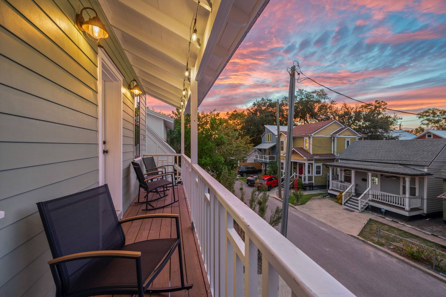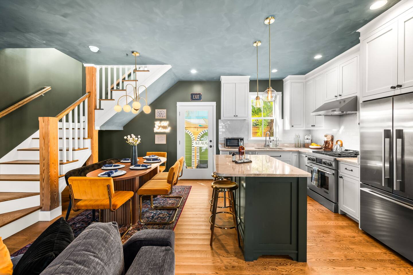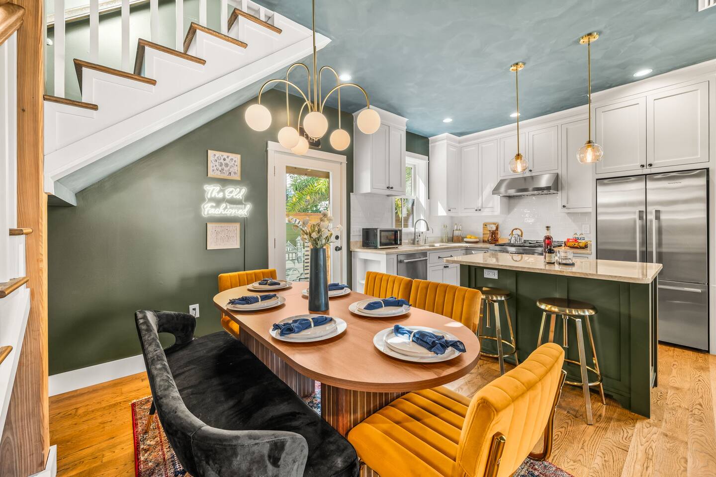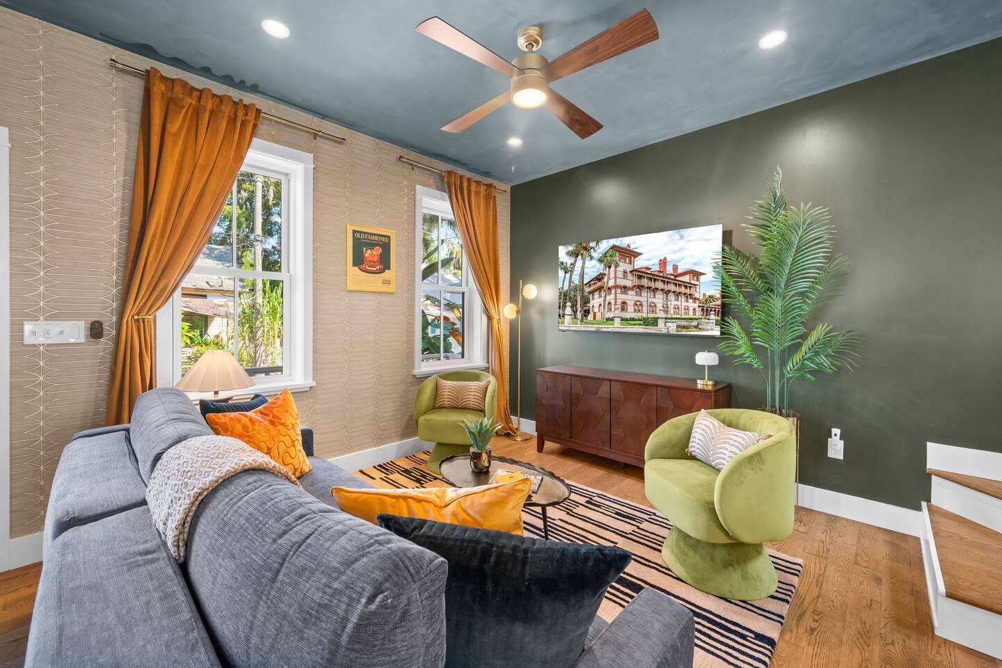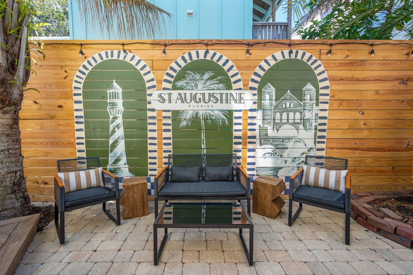 Welcome to The Old Fashioned! Step inside this professionally designed home where modern luxury meets historic St. Augustine charm. Once you’ve explored cobblestone streets and centuries-old landmarks, return to your private Caldera spa hot tub and let stress melt away. Sleep soundly on plush beds, cook in the chef’s kitchen, then gather around the propane fire pit or relax on the spacious back patio under glowing string lights. Just a 5-minute bike ride or 15-minute walk takes you to downtown. Book your stay and enjoy a speakeasy-style blend of history and luxury at The Old Fashioned. 🍸 Entertainment ⭐ 65” HD Smart TV in living room + 55” Smart TVs in each bedroom ⭐ Board games for classic family fun ⭐ Beach chairs ready for your coastal adventures ⭐ Fire pit for cozy evening conversations 🗝️ Work & Connectivity ⭐ Dedicated workspace for remote work ⭐ High-speed Wi-Fi keeps you connected 🥃 Convenience ⭐ Pet-friendly — bring your furry friend ⭐ Driveway parking for two cars ⭐ Full-size washer/dryer with detergent ⭐ Stocked extras: olive oil, spices, coffee, tea, creamers & sweeteners ⭐ Welcome basket with snacks after travel ⭐ Keyless entry for seamless check-in 🎩 Back Patio & Outdoor Oasis ⭐ Luxury Caldera hot tub for evening soaks ⭐ Plenty of seating for cocktails & conversation ⭐ Custom hand-painted mural for Insta-worthy photos ⭐ Propane fire pit for stories under the stars ⭐ String lights for that magical speakeasy glow 🕯️ Main Living Area ⭐ 65” Smart TV for movie nights ⭐ Fully stocked chef’s kitchen with modern tools ⭐ Professionally curated speakeasy-inspired décor ⭐ Dining for six + island bar seating for two 🛏️ Bedrooms ⭐ Plush beds, hotel-quality linens & 55” TVs in every room Primary Suite: King bed, desk, Smart TV Bedroom 2: Queen bed, professionally designed décor, Smart TV Living Room: Sleeper sofa for additional guests 🚿 Bathrooms ⭐ Stocked with luxury toiletries, plush towels & hair dryer Bathroom 1 (Upstairs): Shower/tub combo, vanity, toilet Half Bath (Downstairs): Vanity & toilet Why Book The Old Fashioned? More than just a rental, this home is a boutique-speakeasy escape in the heart of St. Augustine. Every detail was professionally designed — from curated décor to chef-worthy kitchen — blending historic charm and modern comfort. Sip cocktails by the fire pit, snap photos in stylish rooms, or unwind in the hot tub after exploring. Perfect for romantic escapes, family getaways, or friends’ weekends, The Old Fashioned turns every moment into a memory. 📍 Location (Lincolnville) ⭐ 0.5 mi – St. George Street ⭐ 0.9 mi – Flagler College ⭐ 1.0 mi – Bridge of Lions ⭐ 1.1 mi – Castillo de San Marcos ⭐ 4.8 mi – Vilano Beach ⭐ 5.4 mi – St. Augustine Beach ⭐ 3.3 mi – Flagler Hospital ⭐ 3.2 mi – St. Augustine Amphitheatre 🥂 Book Your Stay Don’t just visit St. Augustine — experience it in style. Book The Old Fashioned today and discover the perfect blend of history, speakeasy flair, and luxury living.