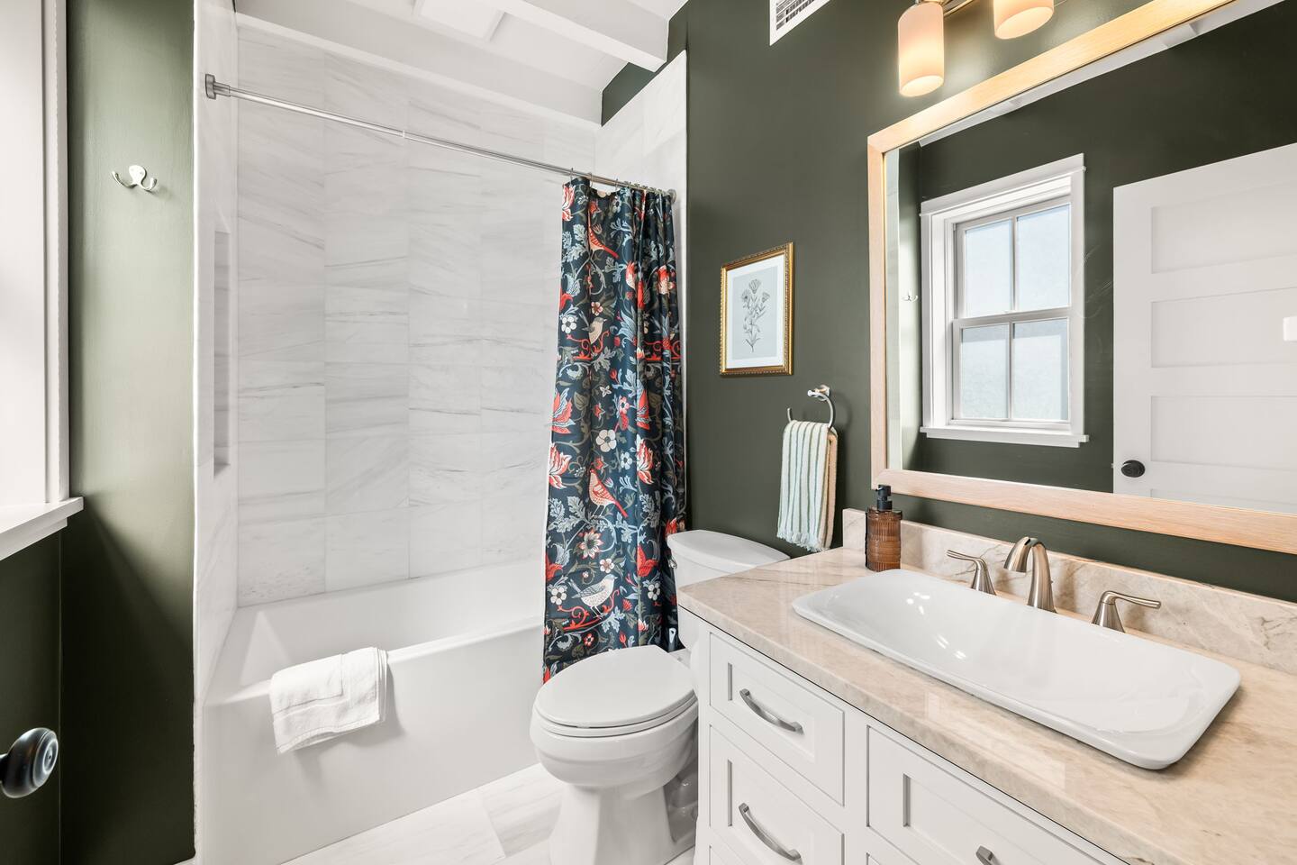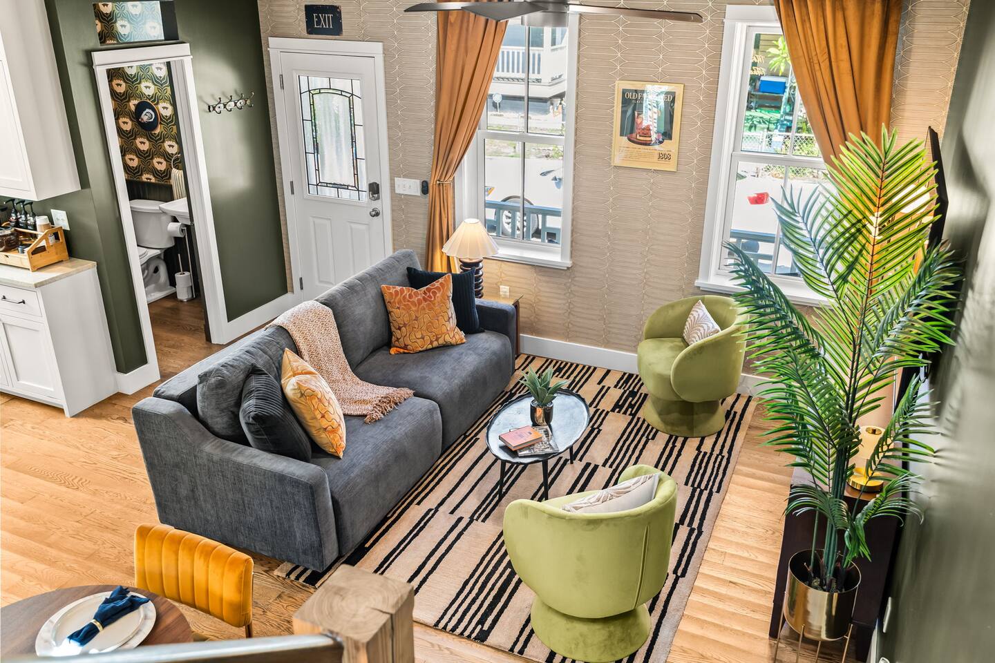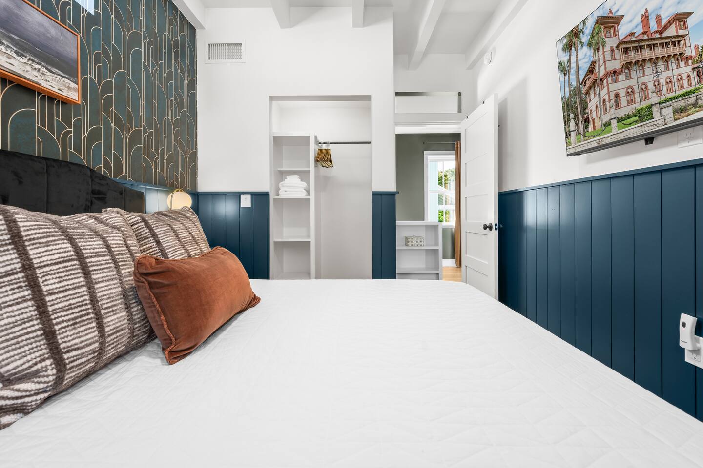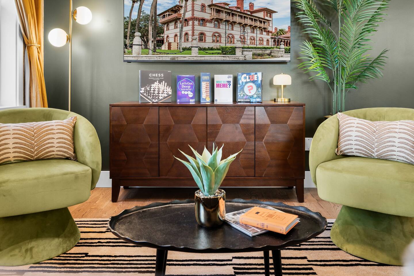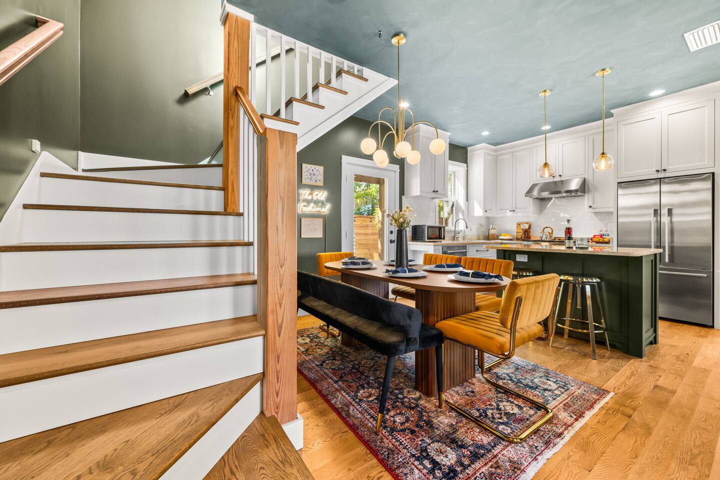 Welcome to The Old Fashioned! Step inside this professionally designed home where modern luxury meets historic St. Augustine charm. Once you’ve explored cobblestone streets and centuries-old landmarks, return to your private Caldera spa hot tub and let stress melt away. Sleep soundly on plush beds, cook in the chef’s kitchen, then gather around the propane fire pit or relax on the spacious back patio under glowing string lights. Just a 5-minute bike ride or 15-minute walk takes you to downtown. Book your stay and enjoy a speakeasy-style blend of history and luxury at The Old Fashioned. 🍸 Entertainment ⭐ 65” HD Smart TV in living room + 55” Smart TVs in each bedroom ⭐ Board games for classic family fun ⭐ Beach chairs ready for your coastal adventures ⭐ Fire pit for cozy evening conversations 🗝️ Work & Connectivity ⭐ Dedicated workspace for remote work ⭐ High-speed Wi-Fi keeps you connected 🥃 Convenience ⭐ Pet-friendly — bring your furry friend ⭐ Driveway parking for two cars ⭐ Full-size washer/dryer with detergent ⭐ Stocked extras: olive oil, spices, coffee, tea, creamers & sweeteners ⭐ Welcome basket with snacks after travel ⭐ Keyless entry for seamless check-in 🎩 Back Patio & Outdoor Oasis ⭐ Luxury Caldera hot tub for evening soaks ⭐ Plenty of seating for cocktails & conversation ⭐ Custom hand-painted mural for Insta-worthy photos ⭐ Propane fire pit for stories under the stars ⭐ String lights for that magical speakeasy glow 🕯️ Main Living Area ⭐ 65” Smart TV for movie nights ⭐ Fully stocked chef’s kitchen with modern tools ⭐ Professionally curated speakeasy-inspired décor ⭐ Dining for six + island bar seating for two 🛏️ Bedrooms ⭐ Plush beds, hotel-quality linens & 55” TVs in every room Primary Suite: King bed, desk, Smart TV Bedroom 2: Queen bed, professionally designed décor, Smart TV Living Room: Sleeper sofa for additional guests 🚿 Bathrooms ⭐ Stocked with luxury toiletries, plush towels & hair dryer Bathroom 1 (Upstairs): Shower/tub combo, vanity, toilet Half Bath (Downstairs): Vanity & toilet Why Book The Old Fashioned? More than just a rental, this home is a boutique-speakeasy escape in the heart of St. Augustine. Every detail was professionally designed — from curated décor to chef-worthy kitchen — blending historic charm and modern comfort. Sip cocktails by the fire pit, snap photos in stylish rooms, or unwind in the hot tub after exploring. Perfect for romantic escapes, family getaways, or friends’ weekends, The Old Fashioned turns every moment into a memory. 📍 Location (Lincolnville) ⭐ 0.5 mi – St. George Street ⭐ 0.9 mi – Flagler College ⭐ 1.0 mi – Bridge of Lions ⭐ 1.1 mi – Castillo de San Marcos ⭐ 4.8 mi – Vilano Beach ⭐ 5.4 mi – St. Augustine Beach ⭐ 3.3 mi – Flagler Hospital ⭐ 3.2 mi – St. Augustine Amphitheatre 🥂 Book Your Stay Don’t just visit St. Augustine — experience it in style. Book The Old Fashioned today and discover the perfect blend of history, speakeasy flair, and luxury living.