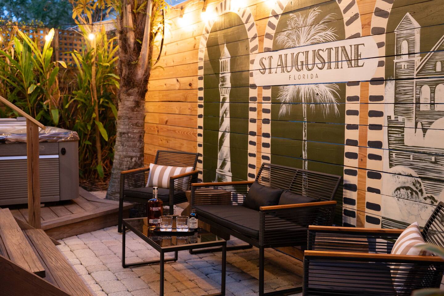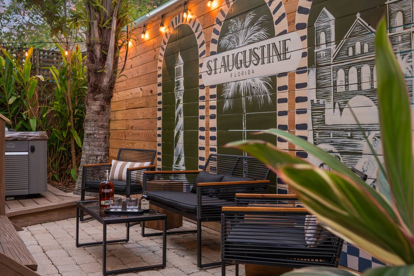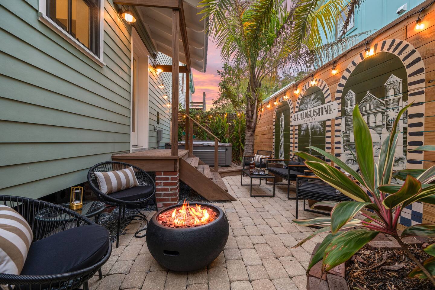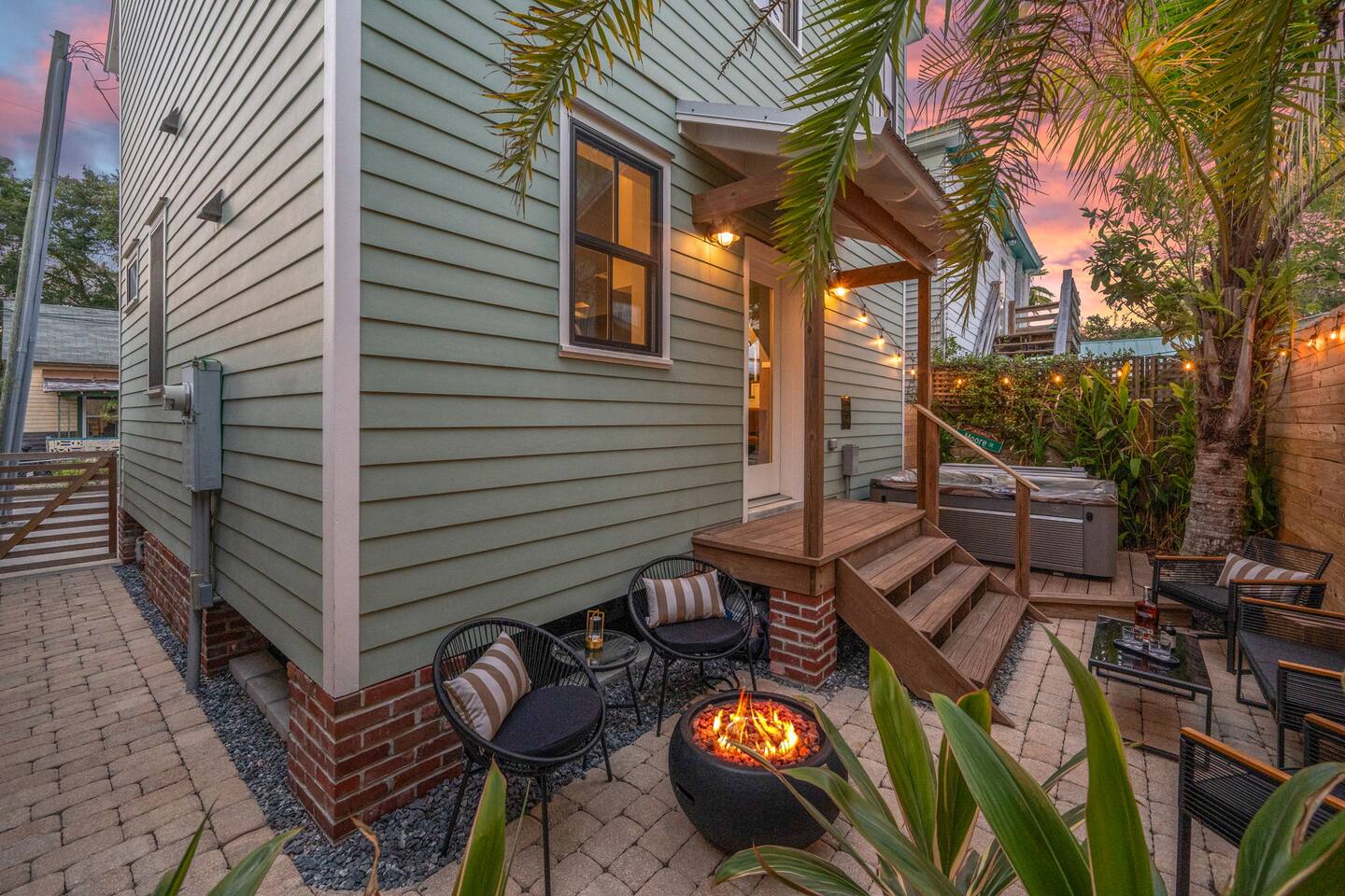 Stay steps from an Old Town Trolley stop, with effortless access to St Augustine’s historic charm. This designer retreat blends modern luxury, perfect for relaxing evenings, productive workdays, and exploring downtown just minutes away. ⭐️ High End Caldera Spa ⭐️ Propane Fire Pit ⭐️ Dedicated workspace and reliable top-speed internet ⭐️ King Bed ⭐️ Pet-friendly ⭐️ 5-minute bike ride/10-15 minute walk to downtown ⭐️ Parking for up to 2 cars ⭐️ Fully stocked gourmet kitchen ⭐️ High Speed Internet