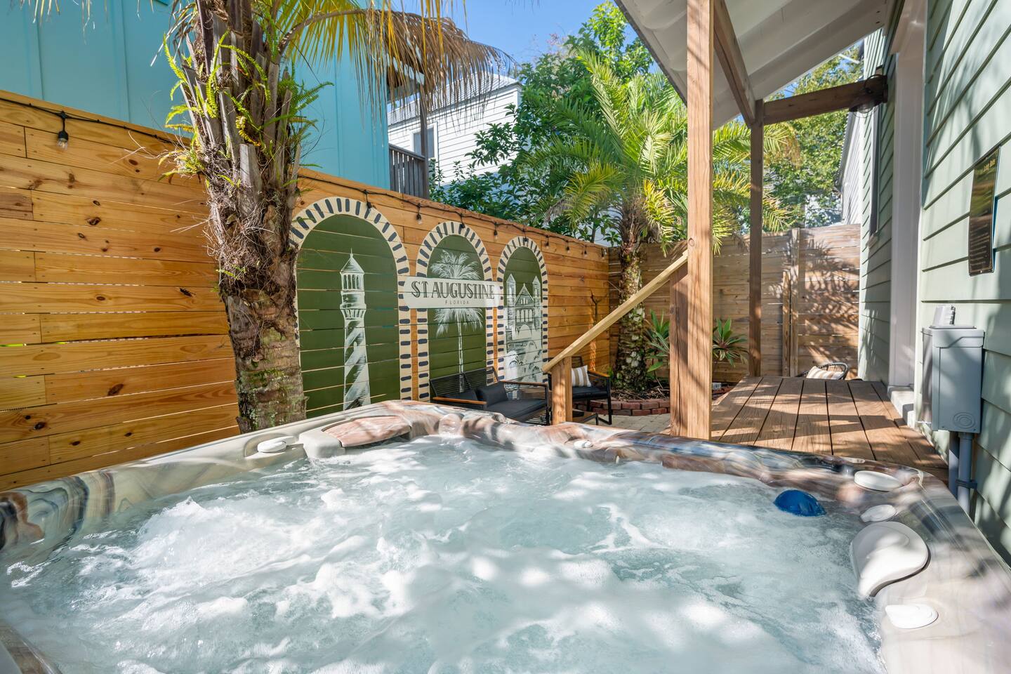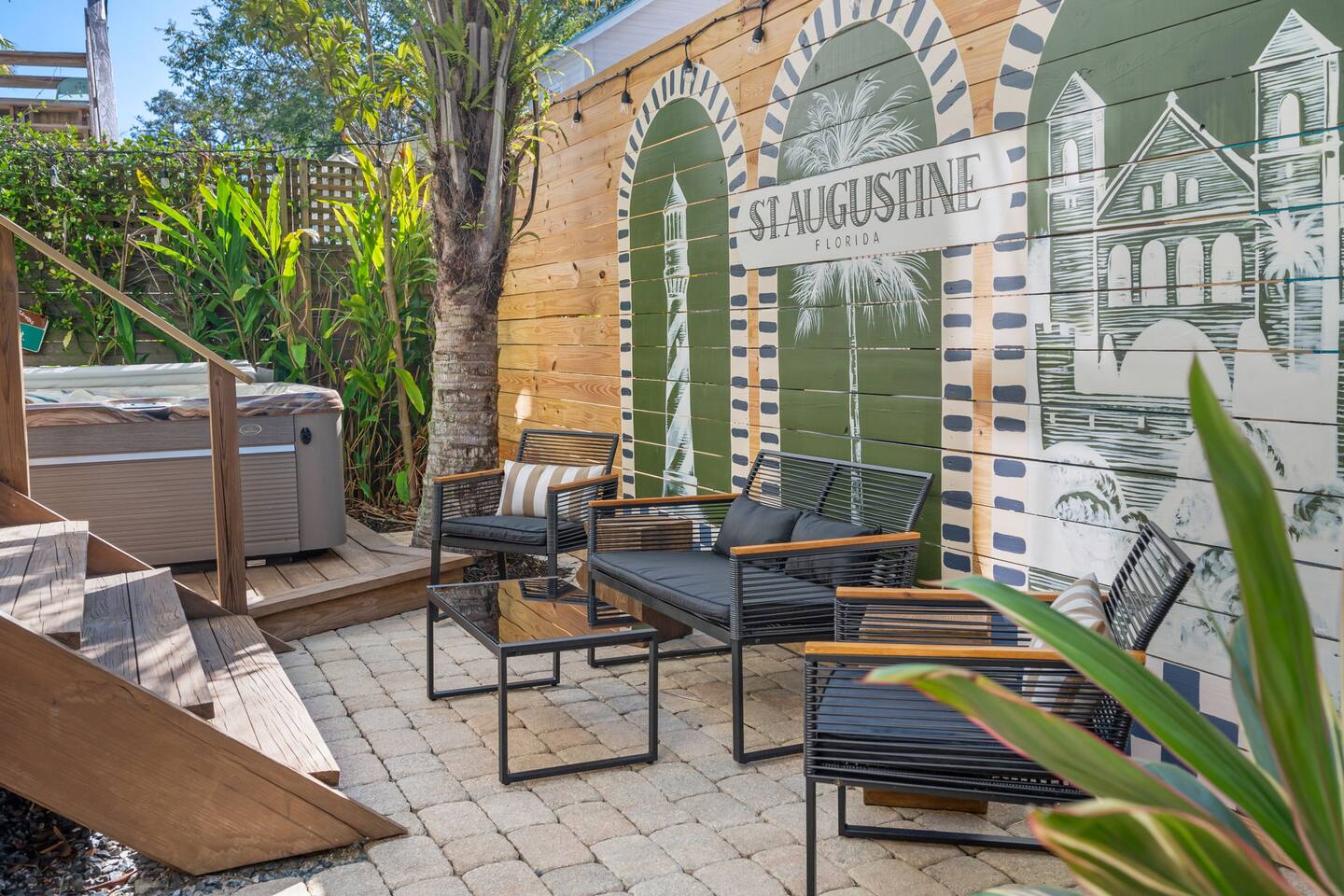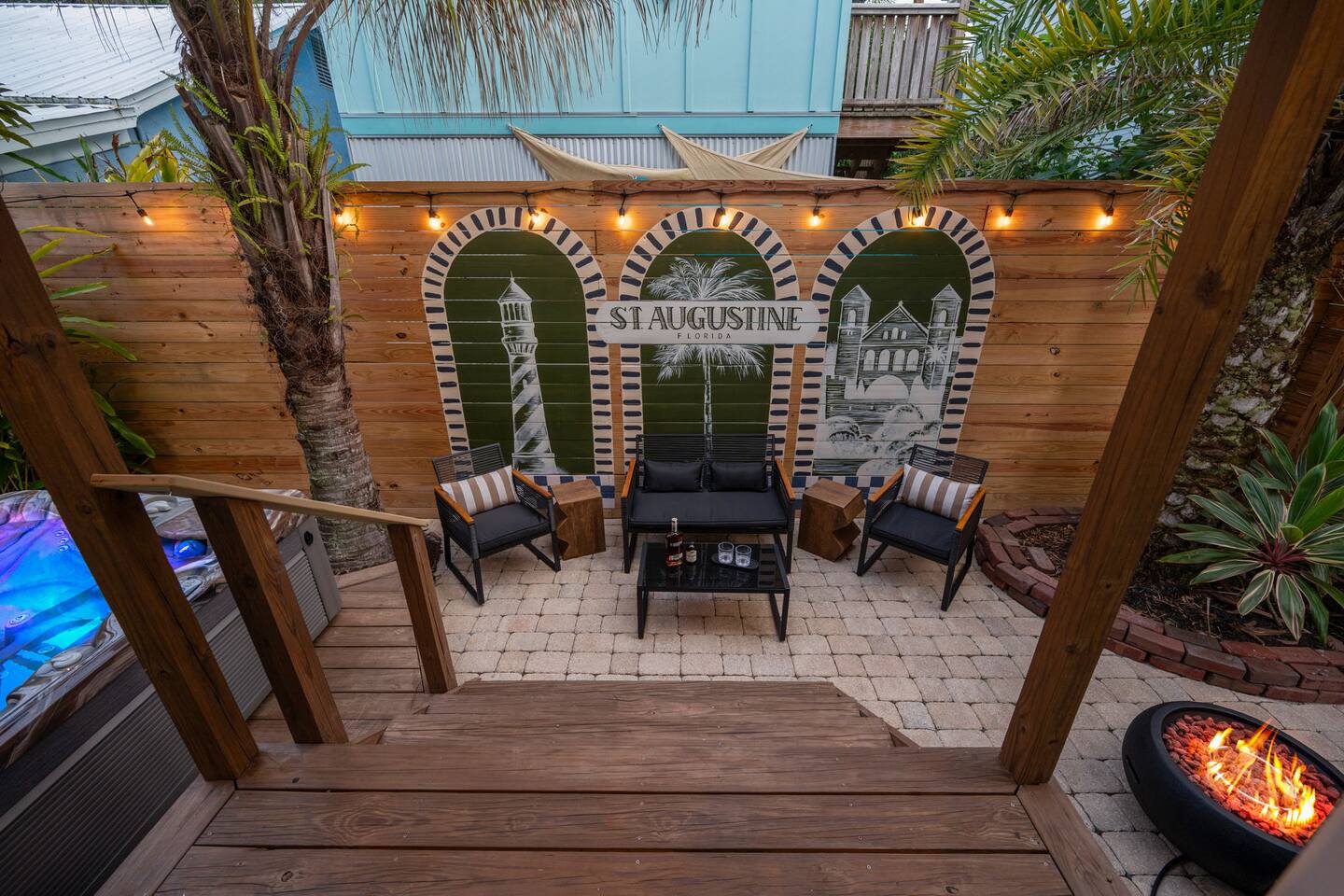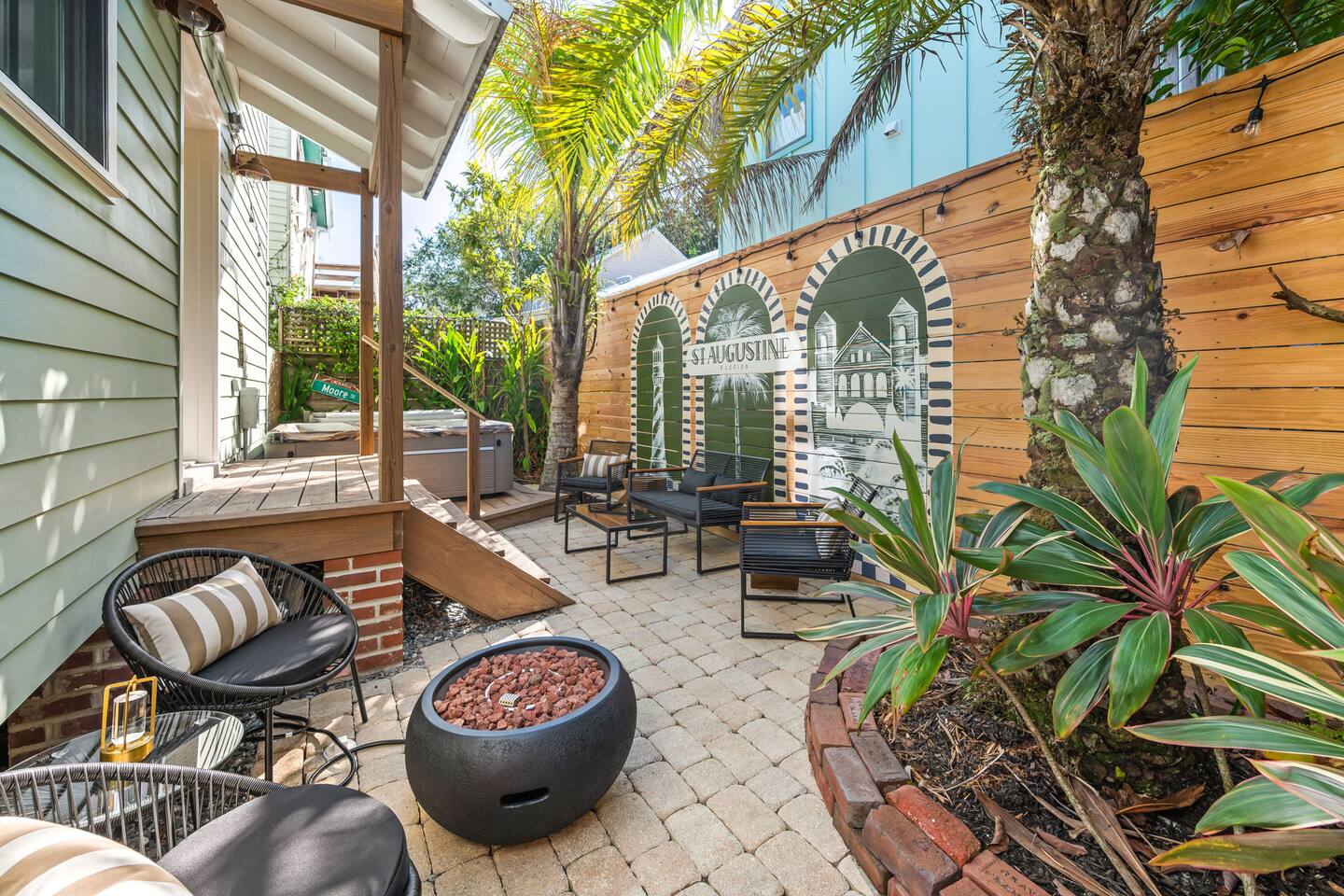 Stay steps from an Old Town Trolley stop, with effortless access to St Augustine’s historic charm. This designer retreat blends modern luxury, perfect for relaxing evenings, productive workdays, and exploring downtown just minutes away. ⭐️ High End Caldera Spa ⭐️ Propane Fire Pit ⭐️ Dedicated workspace and reliable top-speed internet ⭐️ King Bed ⭐️ Pet-friendly ⭐️ 5-minute bike ride/10-15 minute walk to downtown ⭐️ Parking for up to 2 cars ⭐️ Fully stocked gourmet kitchen ⭐️ High Speed Internet