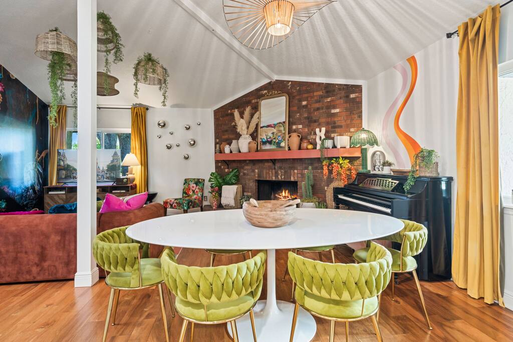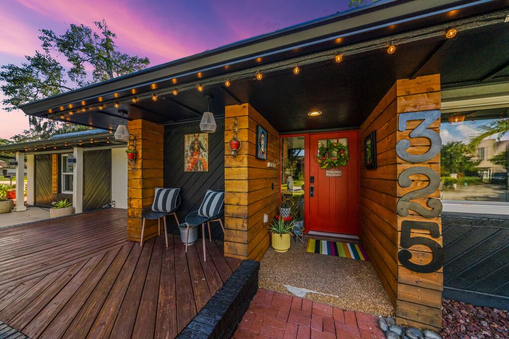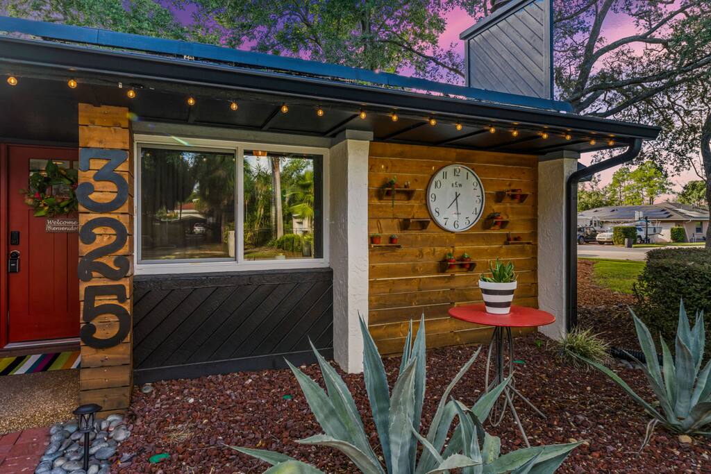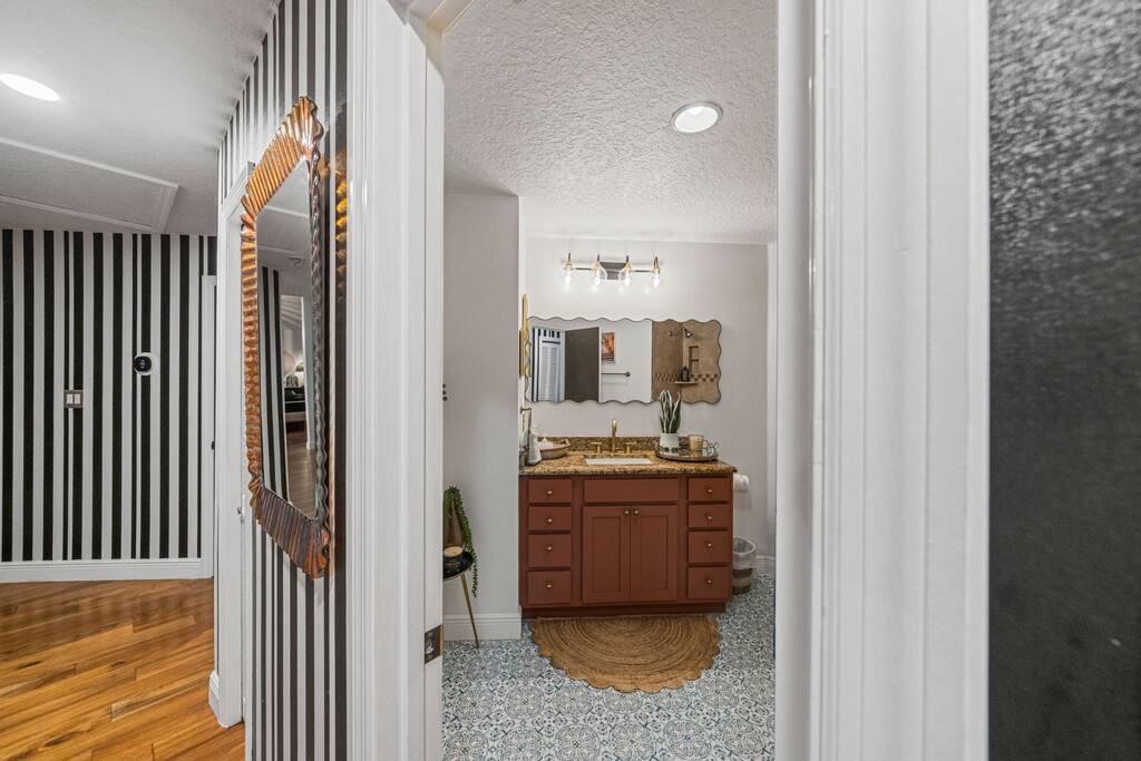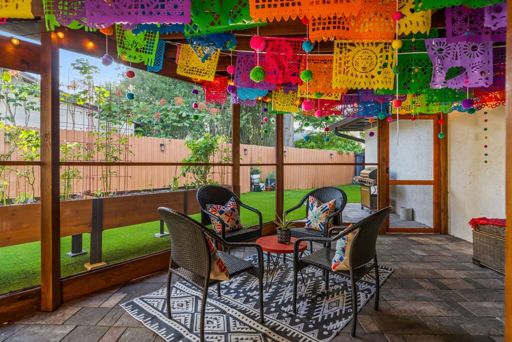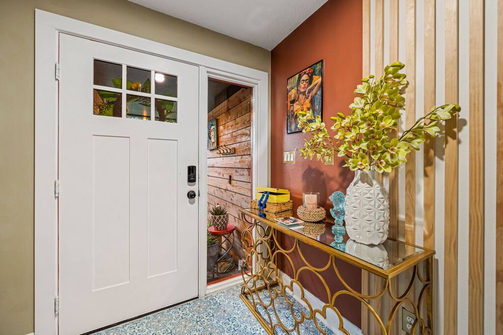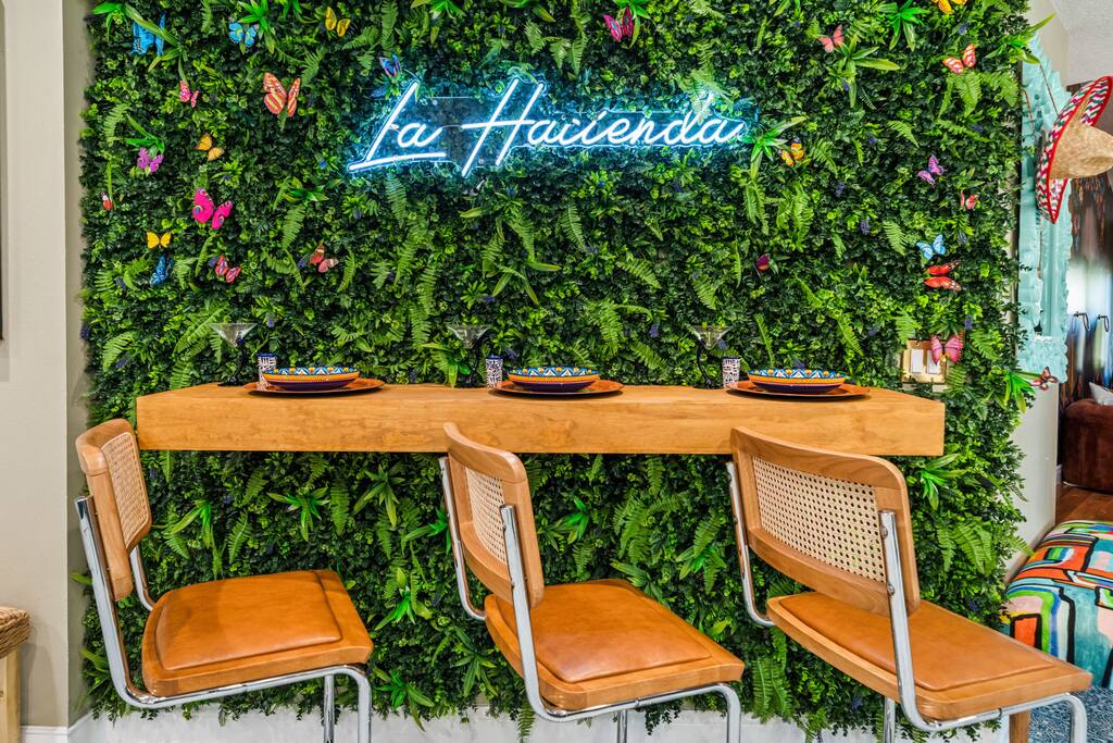 Welcome to La Hacienda, a professionally designed retreat in Central Florida that transports you straight to the heart of Mexico. From vibrant papel picado fluttering above to hand-picked artwork honoring Frida Kahlo and traditional artisans, every corner tells a story of culture and celebration. This six-bedroom, three-bath oasis isn’t just a place to sleep—it’s a colorful canvas where families and groups can gather, connect, and create memories surrounded by warmth and artistry. 🛋 Main Living Area Bright, art-filled lounge perfect for movie nights or conversation Large dining table for group meals and celebrations Open layout designed for comfort and connection 🍳 Kitchen & Dining Fully equipped chef’s kitchen with modern appliances Handcrafted accents and vibrant tilework for an authentic touch Outdoor dining under festive papel picado for unforgettable meals 🌿 Outdoor Space Private patio and garden lounge with colorful décor Gathering spots designed for relaxation and celebration Lush greenery for a true hacienda vibe 🛏 Bedrooms & Bathrooms Bedroom 1 – King Suite Spacious master at the far left of the home King bed with plush linens Bedroom 2 – Full Bedroom Located off Bedroom 1 Full bed, cozy setup for two Bedroom 3 – King Suite Master bedroom at the end of the hallway King bed with stylish décor Bedroom 4 – Queen Bedroom Second door to the right in the hallway Queen bed, vibrant and comfortable Bedroom 5 – Full Bedroom First door to the right in the hallway Full bed with fresh linens Bedroom 6 – Twin Bedroom First door to the left in the hallway Two twin beds, perfect for kids or friends 🛁 Bathrooms (3) Three well-appointed bathrooms with modern finishes. Fresh towels, toiletries, and essentials included 🎨 Design & Atmosphere Professionally designed interiors inspired by Mexican culture Homage to Frida Kahlo and traditional artistry Every detail crafted to make your stay inspiring and memorable 📍 Location Nestled in a quiet neighborhood of Central Florida Easy access to Orlando attractions, Disney World, stunning beaches, Universal Studios. Close to local dining and cultural experiences 💡 Why Book La Hacienda is more than a stay, it’s an experience. Perfect for group getaways, family gatherings, or unique celebrations, it blends vibrant design with modern comfort to create a one-of-a-kind retreat. Book now and make unforgettable memories in a home that tells a story.